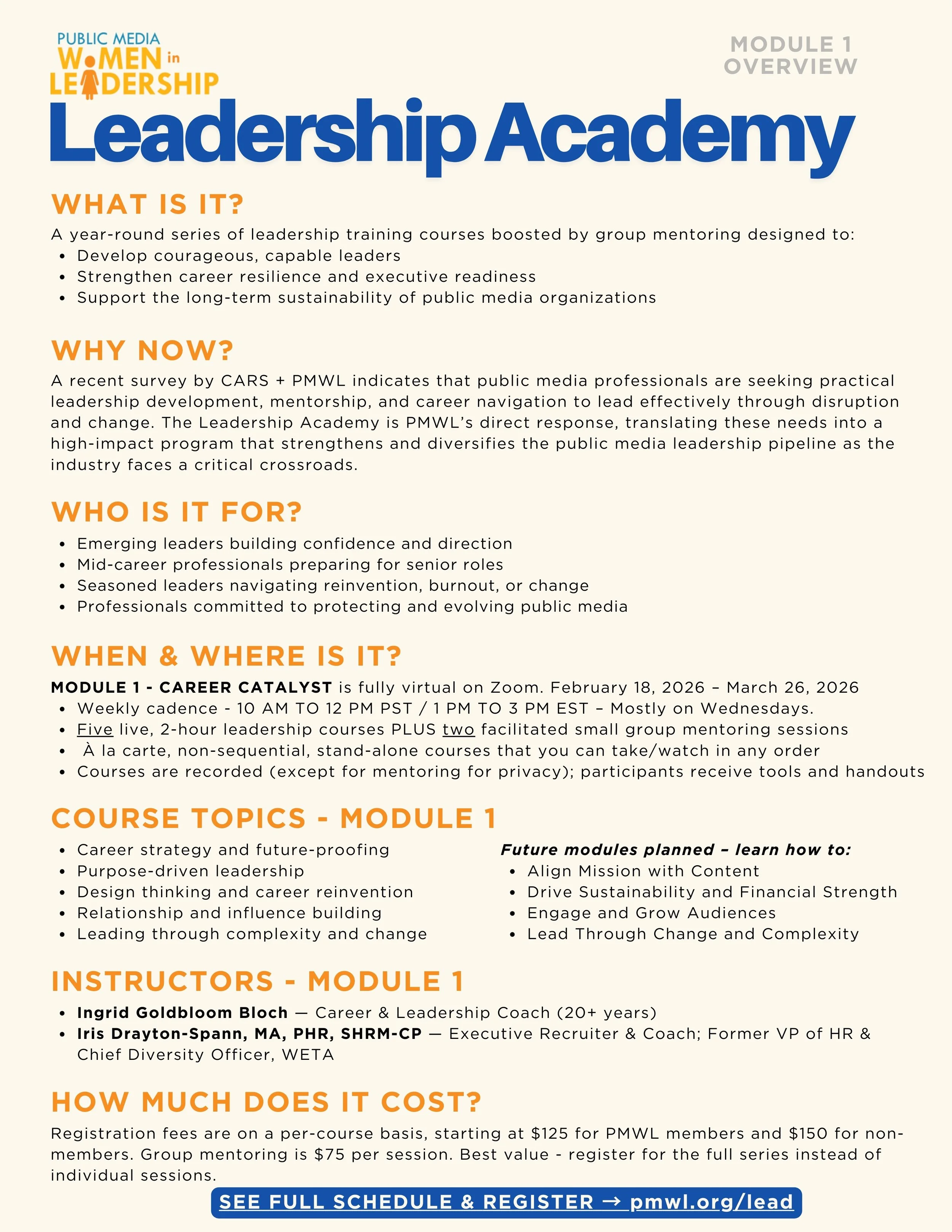 About PMWL What We Do Who We Are Executive Director Board Members Press Leadership AcademyBrave Talk Programs Mentoring Program Connection Hour Bootcamp Ambassadors Speaker's Bureau Women's Leadership Giving Study Community Our Community Brave Talk: The Blog Resources Recorded Webinars Get Involved Impact Report_CARS_June 2025